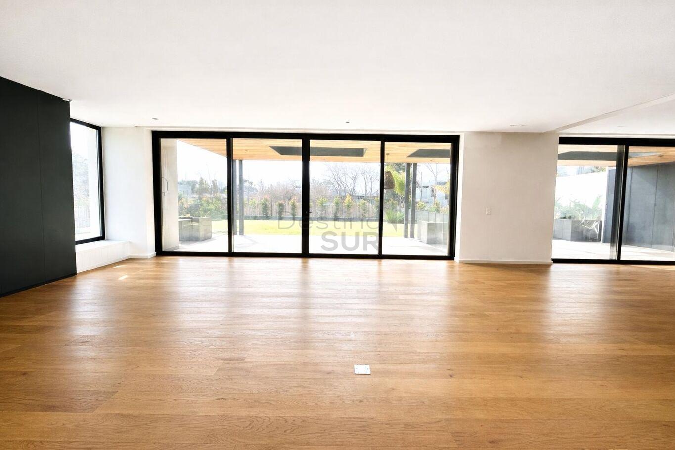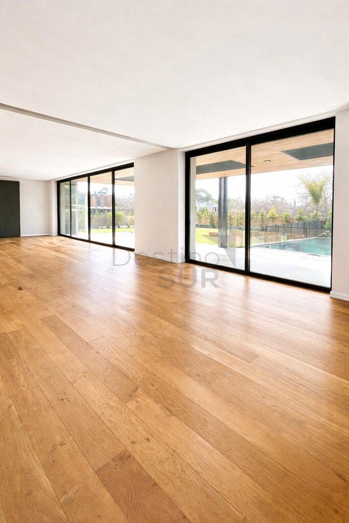 En planta baja: hall de entrada, toilette, amplio living-comedor con estufa a leña, estar, cocina con isla. Todos los ambientes con salida a una gran terraza techada y comunicados por puertas corredizas entre si.