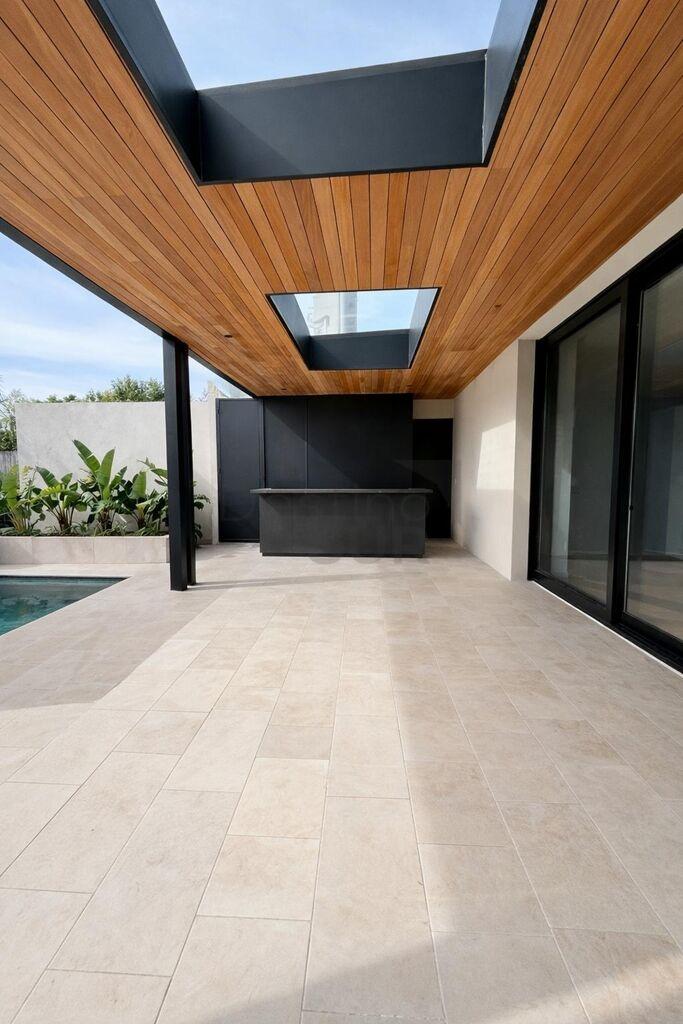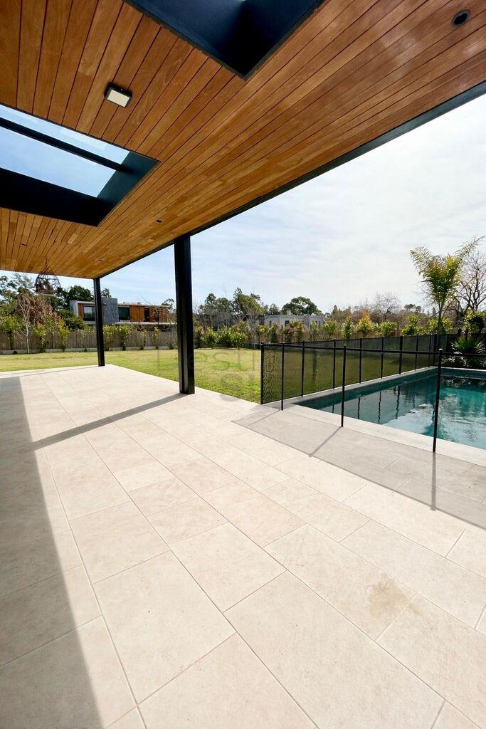 En exterior: gran terraza techada con parrillero y barra, piscina climatizada, muy lindo jardín con excelente orientación.